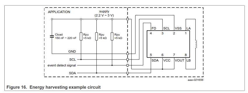 The datasheet also recommends a 150–220nF capacitor between VOUT and GND to stabilize the harvested voltage during RF modulation.