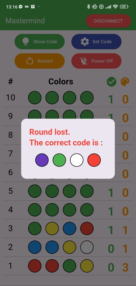 The app connects to the electronic Mastermind board, retrieves data from its GATT service, reconstruct the full game history in real time and display it to the player. It can also transmit the commands mentionned in the previous part back to the board.